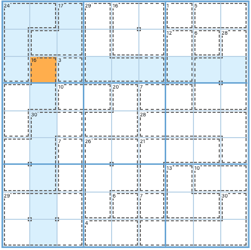 En este ejemplo, encontramos tres jaulas completamente contenidas dentro del grupo de 3x3 en la esquina superior izquierda (24, 17, 3). Sin embargo, la celda seleccionada pertenece a una jaula que cruza a otro grupo. Apliquemos la regla del 45 a las jaulas contenidas: 45-24-17-3=1. La solución para la celda seleccionada es 1.