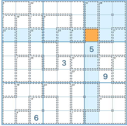 In the grid above, the 3x3 group in the top right corner has two contained cages (28 and 10) and two outlier cells. Let’s apply the 45-rule to the contained cages: 45-28-10=7